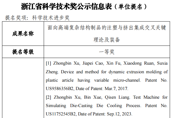 根據(jù)《浙江省科學(xué)技術(shù)廳關(guān)于開(kāi)展2023年度浙江省科學(xué)技術(shù)獎(jiǎng)提名工作的通知》有關(guān)要求,現(xiàn)將德清申達(dá)機(jī)器制造有限公司作為完成人工作單位的成果(成果名稱(chēng):面向高端復(fù)雜結(jié)構(gòu)制品的注塑與擠出集成交叉關(guān)鍵理論及裝備)相關(guān)內(nèi)容予以公示。公示時(shí)間:2024年8月9日-2024年8月15日。在公示期內(nèi)如有異議,可以來(lái)電或來(lái)信方式反映。凡匿名異議、超出期限異議的,不予受理。聯(lián)系人:金萍萍電話:13706535940電子郵箱:Jinpp@injectionmachine.com